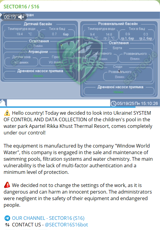 乌克兰当地时间5月19日,黑客组织SECT0R16通过Telegram频道宣称,已成功入侵该国西部著名旅游设施——阿帕特尔里卡胡斯特温泉度假村的儿童游泳池控制系统。此次事件暴露了关键基础设施中水务SCADA系统的重大安全隐患,引发国际网络安全界高度关注。
