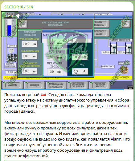 2025年5月19日,黑客组织SECT0R16通过Telegram宣称,已非法控制波兰格但斯克市水务SCADA(数据采集与监控)系统,通过篡改水泵运行时间表、强制激活过滤器手动冲洗功能,导致水处理流程异常中断。该组织同步公开了包含警报标识的监控界面截图及部分攻击操作视频片段,试图验证攻击真实性。