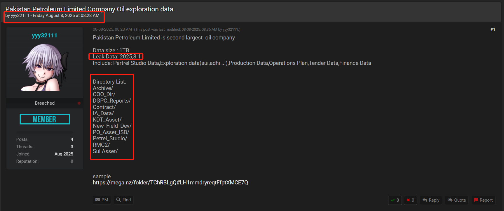 8月8日:暗网论坛BF账号“yyy32111”发布声称已入侵PPL并泄露约1TB内部数据,内容包括Petrel Studio勘探数据、Sui与Adhi油气田生产与运营计划、合同文件、财务资料及官方报告。首批公布的样本文件包括7个Excel表格和1张图片,经核实确系PPL内部文件。该用户标明数据获取的日期是2025年8月1日。