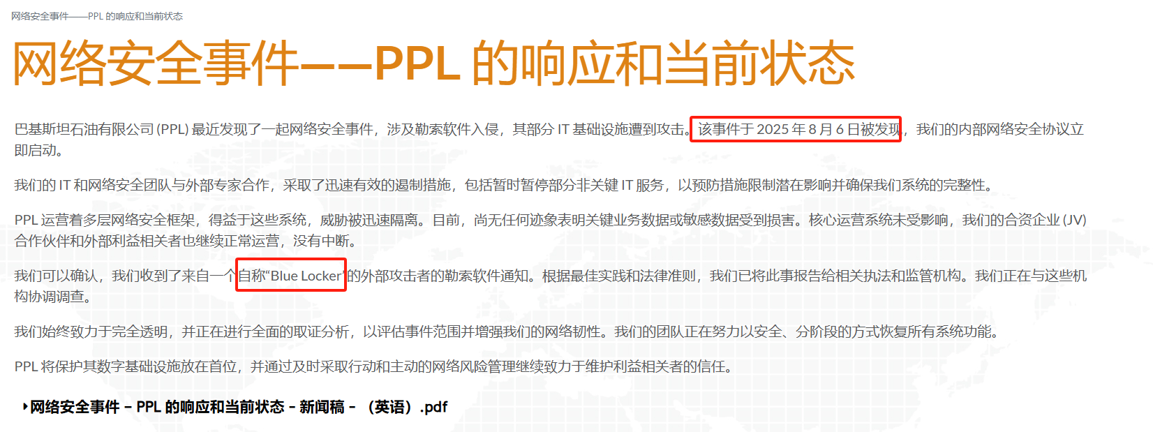 8月6日:PPL官网发布消息,称内部检测到勒索软件入侵,立即启动内部网络安全协议,并暂停部分非关键IT服务以防扩散。